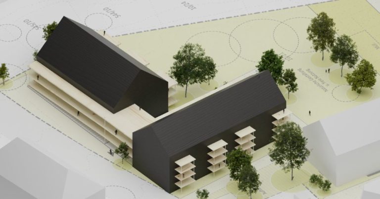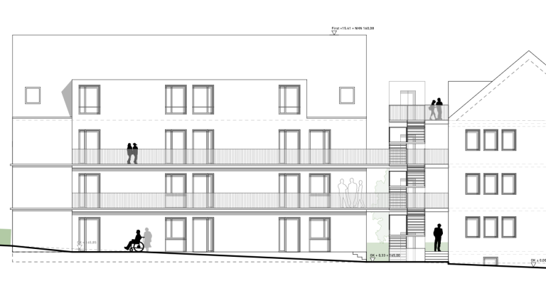 Ergänzend dazu entsteht entlang des Kreuzwegs ein Neubau mit ebenfalls 12 Wohneinheiten, der über einen Verbindungsbau barrierefrei an den Bestand angeschlossen wird. Die Konstruktion erfolgt überwiegend in Holzbauweise mit CLT-Decken, Holzständeraußenwänden sowie tragenden Innenwänden in CLT. Ein vorgestellter Laubengang aus Stahlbeton übernimmt die Erschließung, während Balkone als Stahlkonstruktion ausgeführt werden.