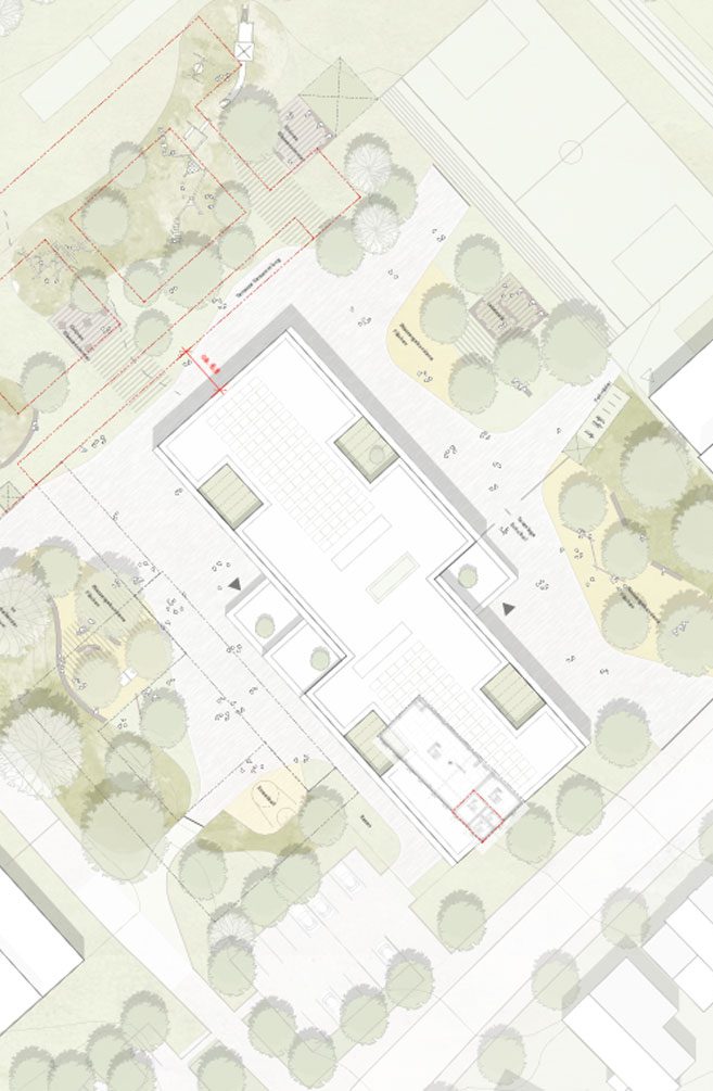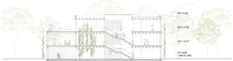 Das energetische Konzept folgt einem Low-Tech-Ansatz mit natürlicher Belüftung und Querlüftung der Aufenthaltsräume. Die Wärmeversorgung ist über den Anschluss an ein Nahwärmenetz vorgesehen, ergänzt durch mögliche Systeme wie Geothermie. Insgesamt entsteht ein nachhaltiges Gebäudekonzept mit reduzierter technischer Komplexität.