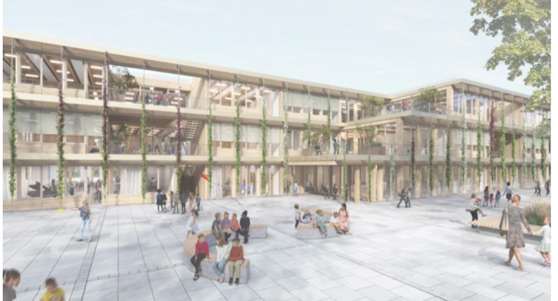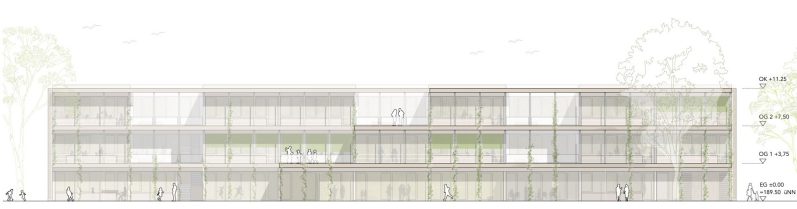 Für einen Schulneubau in Gießen ist ein dreigeschossiges Gebäude in Holz-Skelettbauweise mit hohem Vorfertigungsgrad geplant. Grundlage bildet ein Achsraster von 7,5 m, das eine flexible Raumgestaltung und eine wirtschaftliche Umsetzung mit modularen Bauelementen ermöglicht.